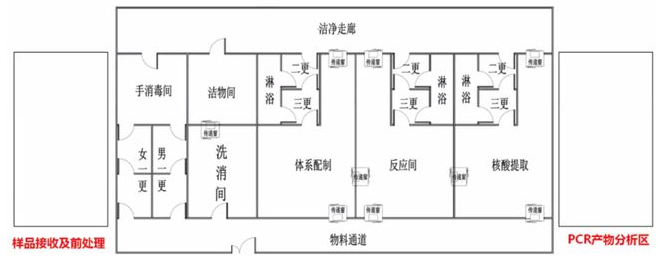 雙走廊四/三區(qū):雙走廊即潔凈走廊和物料通道(普通走廊、污染走廊)。四/三區(qū)主要指中間的功能區(qū),做熒光定量PCR只需三區(qū)足以(體系配制、核酸提取、反應(yīng)間),若是普通PCR/RTPCR,必須有PCR產(chǎn)物分析區(qū)(建議獨(dú)立在三區(qū)之外)。